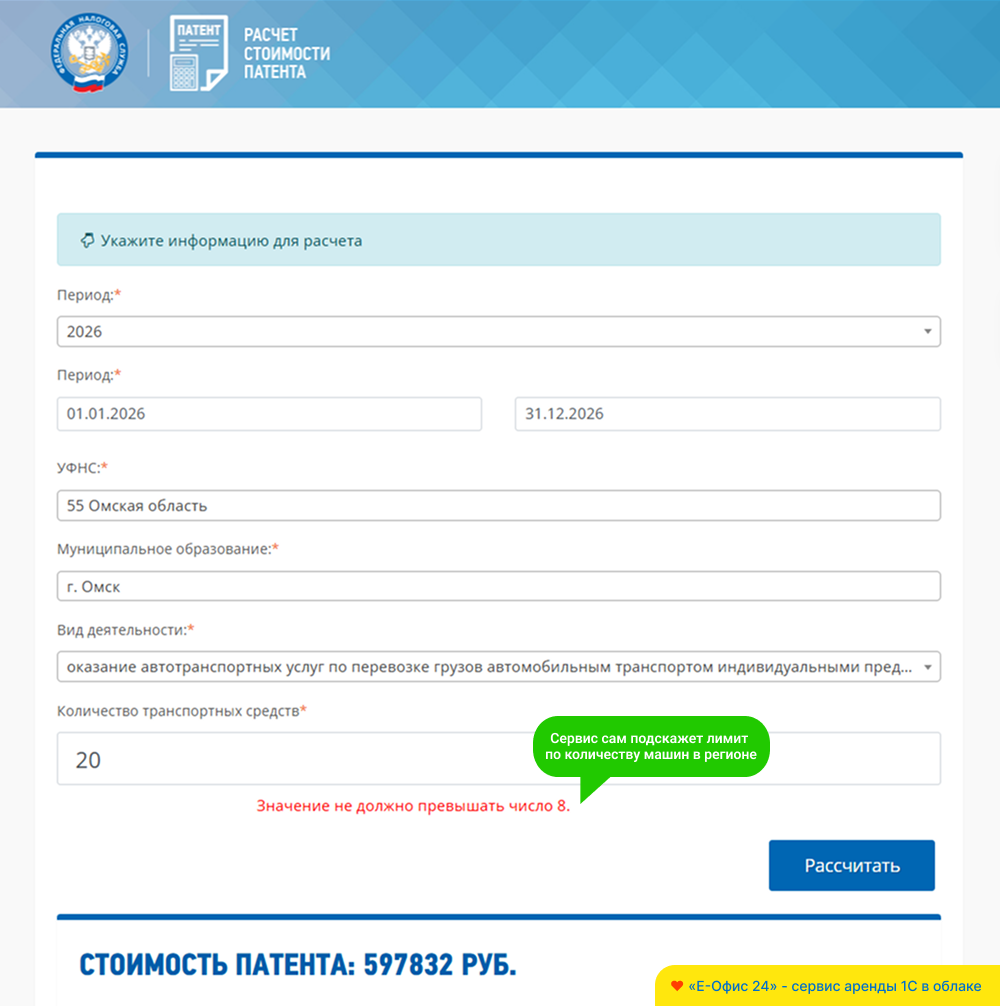 Другой ИП регистрирует бизнес в городе Омск, где есть ограничение — для грузоперевозок можно использовать не более 8 машин. Стоимость патента на год будет 597 832 ₽.